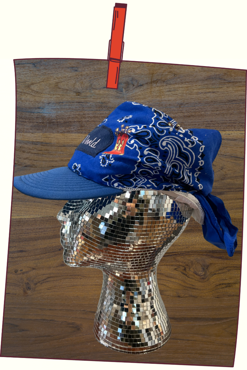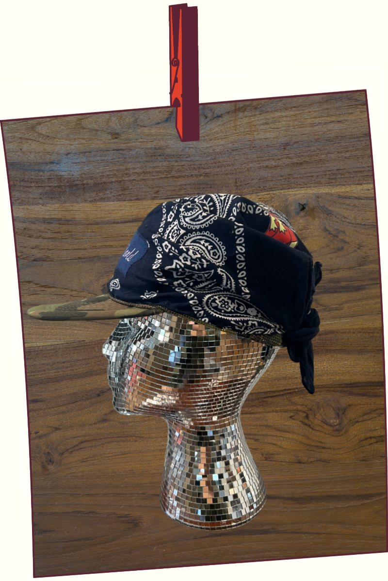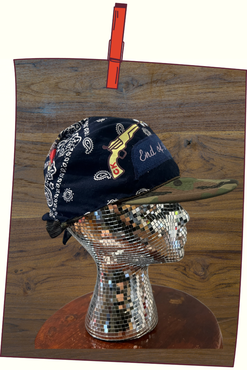 5-panel upcycled trucker hat heat pressed with Carly King Flower Boot Logo